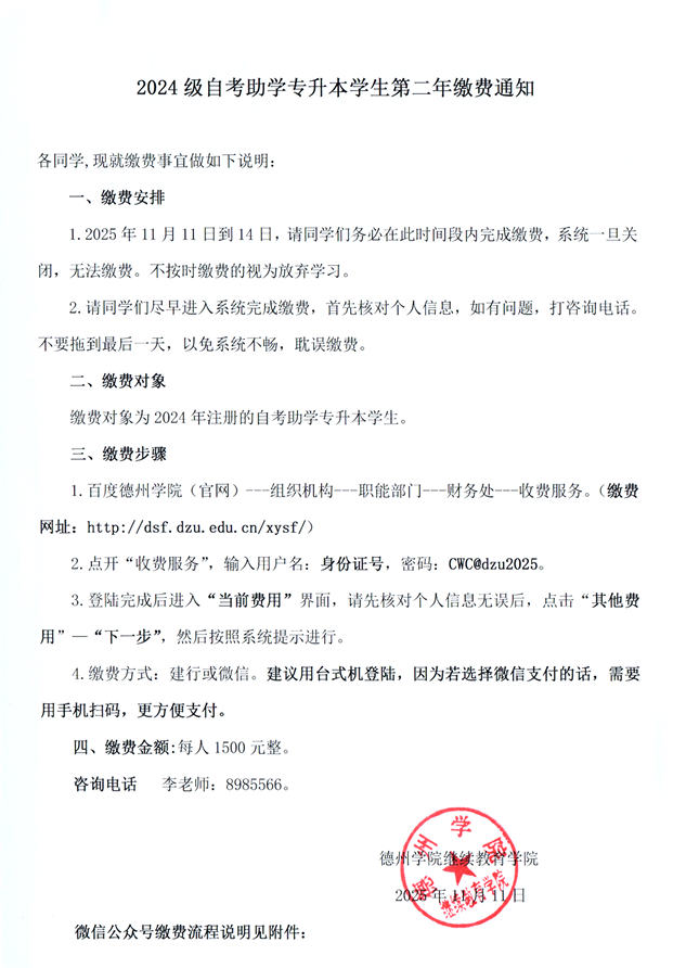 2024级自考助学专升本员工第二年缴费通知