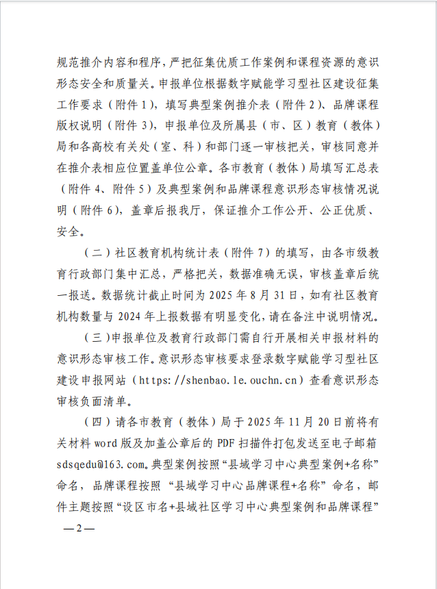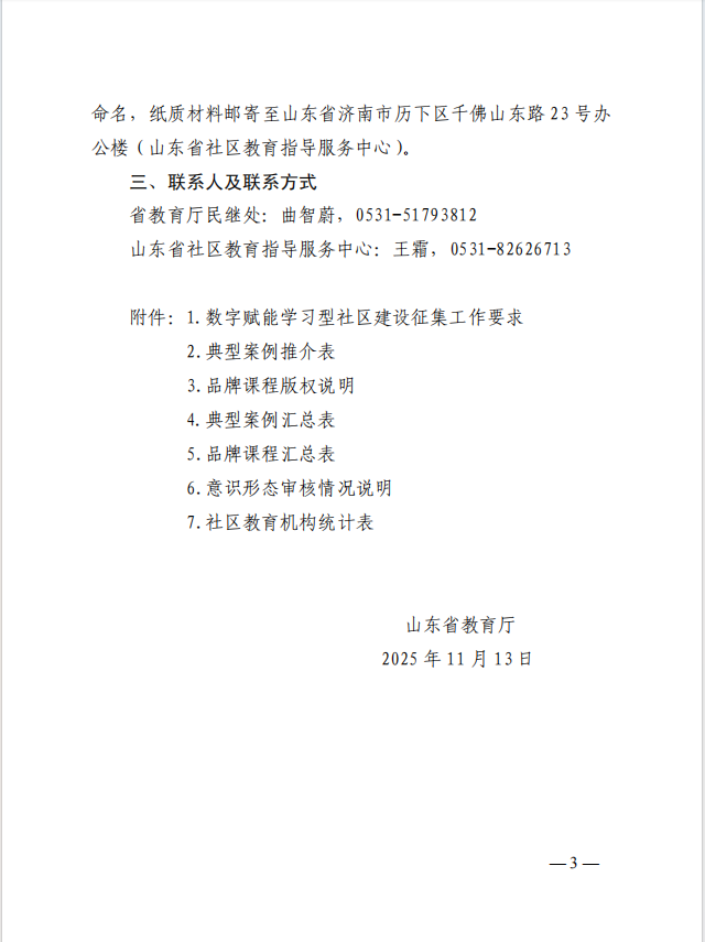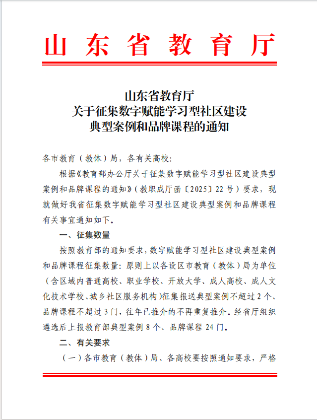 各单位:现转发《山东省教育厅关于征集数字赋能学习型社区建设典型案例和品牌课程的通知》,拟申报老师请于11月17日(周一)前电话联系潘老师,电话0534-8985519。