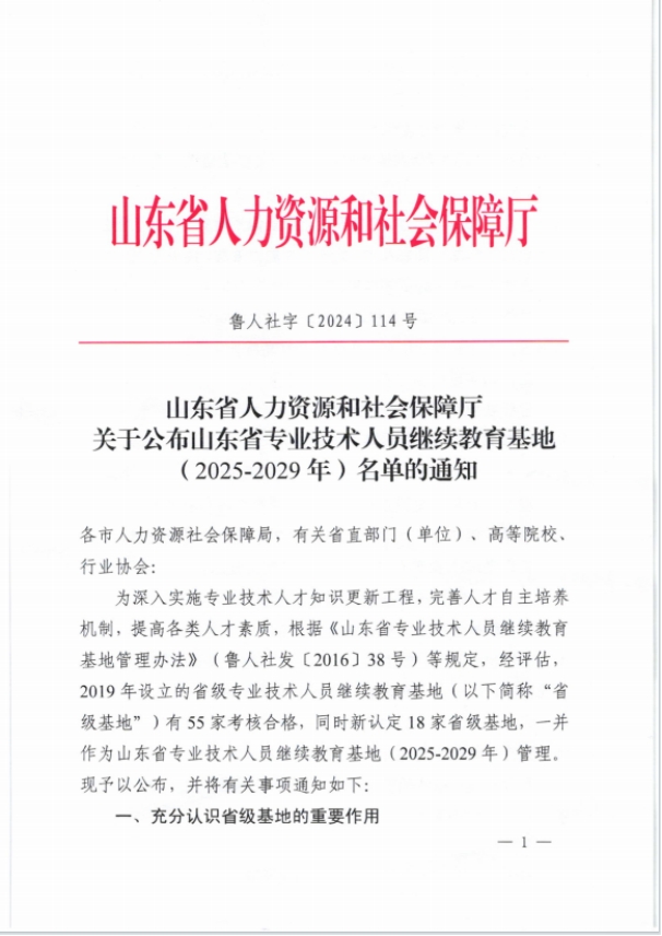 近日,山东省人力资源与社会保障厅公布山东省专业技术人员继续教育基地(2025-2029年)名单,公司成功获批为山东省专业技术人员继续教育基地。